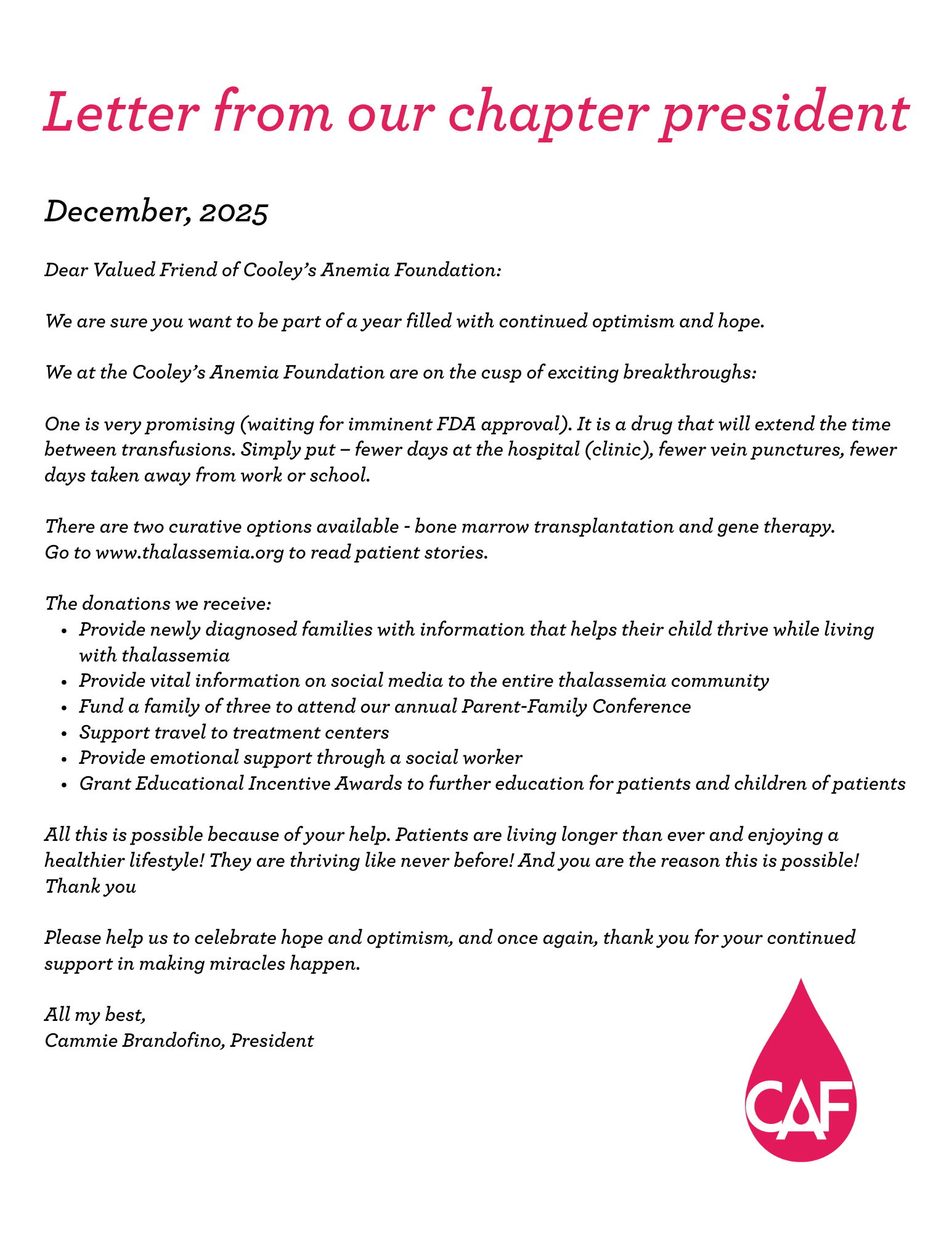 Thank you for considering assisting CAF in its efforts to advocate for all of those battling Thalassemia. Your generosity can transform lives. For individuals with Thalassemia, regular blood transfusions are a critical lifeline, and donors and supporters like you play an essential role in their care.