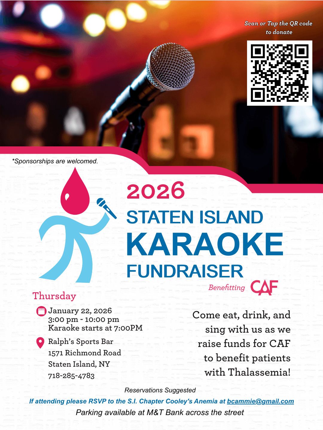 The CAF Staten Island Chapter invites you to an afternoon of karaoke to raise funds and awareness for thalassemia patients.